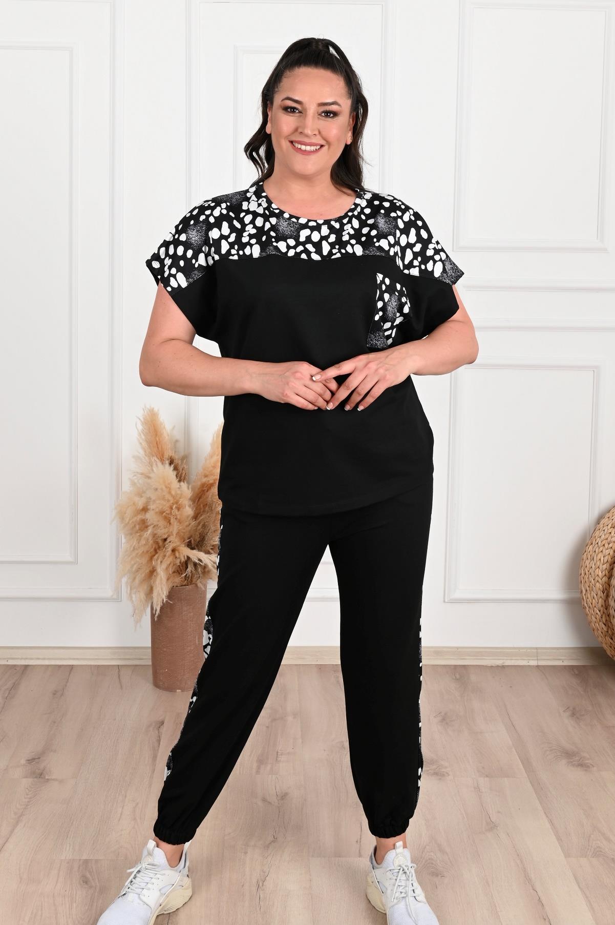 La parte de la pierna de nuestro conjunto de chándal de talla grande es elástica y tiene cintura alta. Te permitirá moverte libremente además de ser flexible. Tenemos detalles de bolsillo en la parte superior del producto. Y con sus estampados coloridos, hace que el producto luzca bastante impresionante. Debido a su estructura de tela, no muestra reacción alérgica en el cuerpo. Material: tejido peinado de 2 hilos hilo: 70% ALGODÓN 25% POLIESTER 5% LYCRA Talla en el maniquí: 3XL.